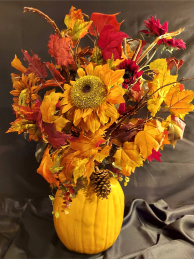 Enjoy this glorious display of fall flowers, leaves, pine cones, acorns, and more. Make a statement in your business lobby, reception area, foyer, on a fireplace hearth or covered front porch.