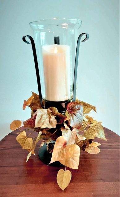 This charming hurricane lamp on a pedestal is a great size that works well in any space, fireplace mantel, anywhere you want a touch of coziness! Decorative leaves add a simplistic look to this piece. Remote-controlled candle is INCLUDED!