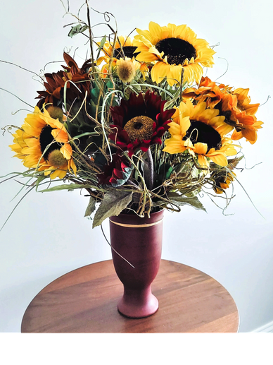 If you love sunflowers you'll love this arrangement. Burgundy, golds, browns, and yellow sunflowers fill this piece with pods, and seagrass.
