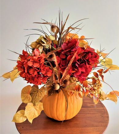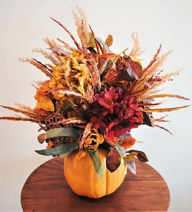 This pumpkin has rich shades of burgundy, rust, green, gold, hydrangeas, seagrass, berries, pods, and ivy.