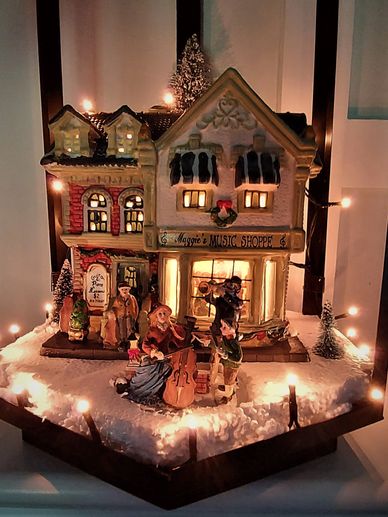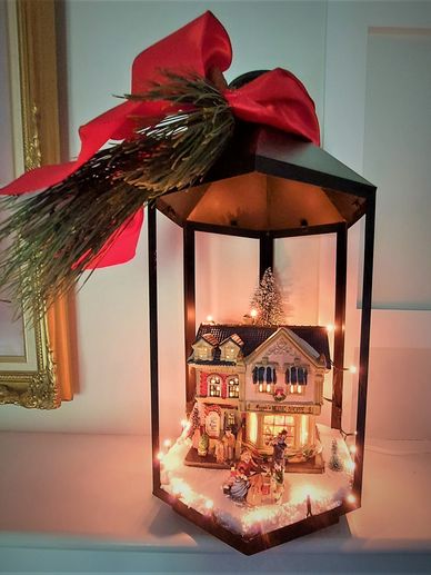 This beautiful lantern depicts the "Ye Ole Nostalgic Music Store" with a trio playing on the sidewalk. This lighted lantern would brighten up any space, counter, table or fireplace mantle. Makes a beautiful gift for history buffs or music store owners, players and lovers!