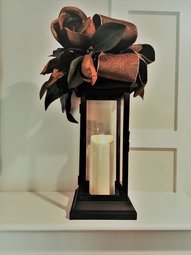 Enjoy the look of traditional magnolias that adorn the top of this flameless candle lantern. The flowers are a muted gold accented with burgundy viens. The bow is burgundy and muted green brocade. This arrangement can be used all-year-round. The candle is attached to the lantern bottom so you never have to worry about it falling over. Insert batteries in lantern base.