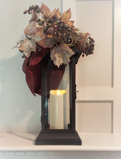 Enjoy the rich traditional look of this Luminara flameless candle lantern! It has every shade of fall accented with a burgundy bow. Really looks great on a fireplace mantle, hutch, entryway, buffet, or center island, anywhere you want to add a cozy feel. The candle is attached to the lantern bottom so you never have to worry about it falling over. Insert batteries in the base of lantern.